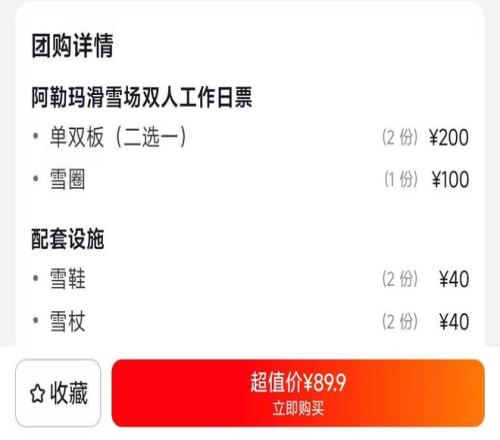 就拿滑雪入場券來說,只要打開團(tuán)購平臺(tái),滿眼都是原價(jià)288元的滑雪票只要48元,甚至還有滑雪場89.9元的門票中包含了2份雪板、一份雪圈、2份雪鞋、2份雪仗的促銷信息,可以說這樣的優(yōu)惠力度讓所有人在購買時(shí)毫無壓力。